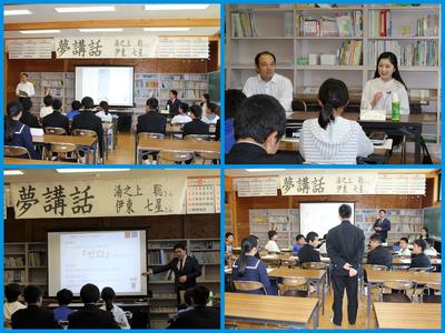 本校で「夢講話」を開催しました。講師は、熊本ヴォルターズ運営会社熊本バスケットボール(株)代表取締役の湯之上 聡さん、熊本ヴォルターズPRユニット ぼるたんガールズの伊東 七星さん のお二人でした。