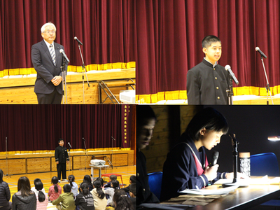 高森中学校の体育館で、高森中学校の1~3年生、高森中央小学校の6年生、そして高森東学園の6~9年生が集まり、人権同和教育講演会を行いました。
