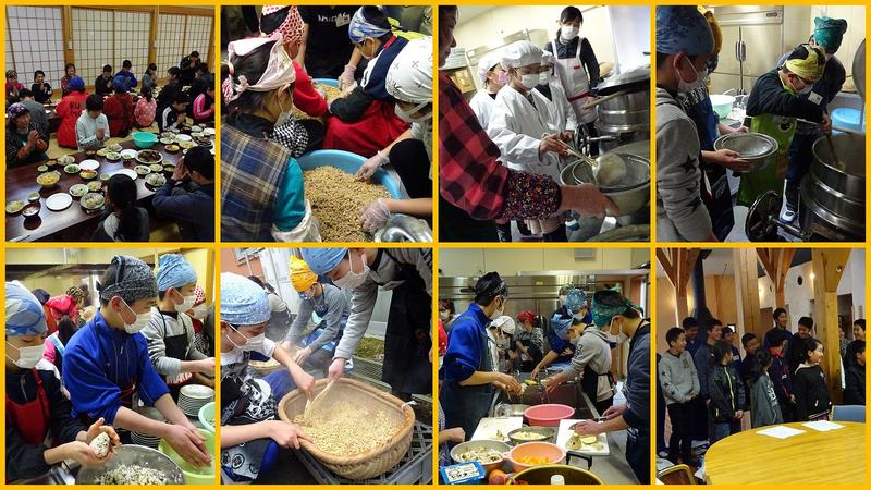 子どもたちが調理場に入ると、そこはもう大豆のにおいでいっぱい。朝早くから地域の方が、大豆を炊いておいてくださいました。午前中は、大豆のあくをとりながら、昼食になる郷土料理づくり。今回は、鹿肉の唐揚げも!おなかいっぱいになった午後は、大豆を冷まし、機械でつぶして、たるにつけ込む作業。