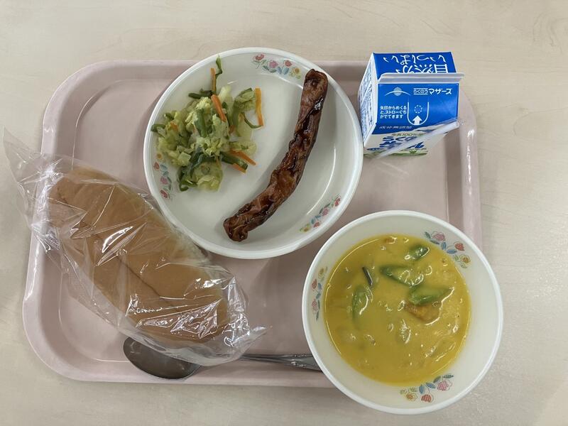 本日のメニュー:コッペパン、牛乳、コーンと卵のスープ、チリコンカン、アセロラゼリー