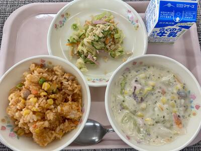 本日のメニュー:チキンライスら白菜のクリーム煮、カシューチップサラダ、牛乳