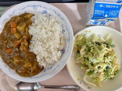 本日のメニュー:チキンカレーライス、アーモンドサラダ、牛乳