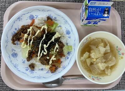 ⭐️本日のメニュー:シシリアンライス、野菜スープ、一食マヨネーズ、牛乳