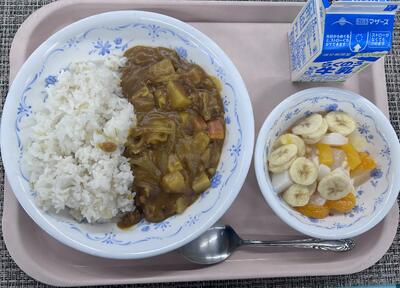 本日のメニュー:ポークカレーライス、フルーツ杏仁、牛乳