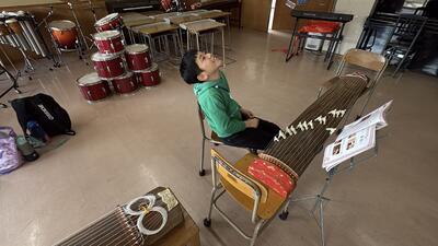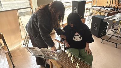 キレイな音色だったので音楽室をのぞくと、「琴」を使った授業でした。
