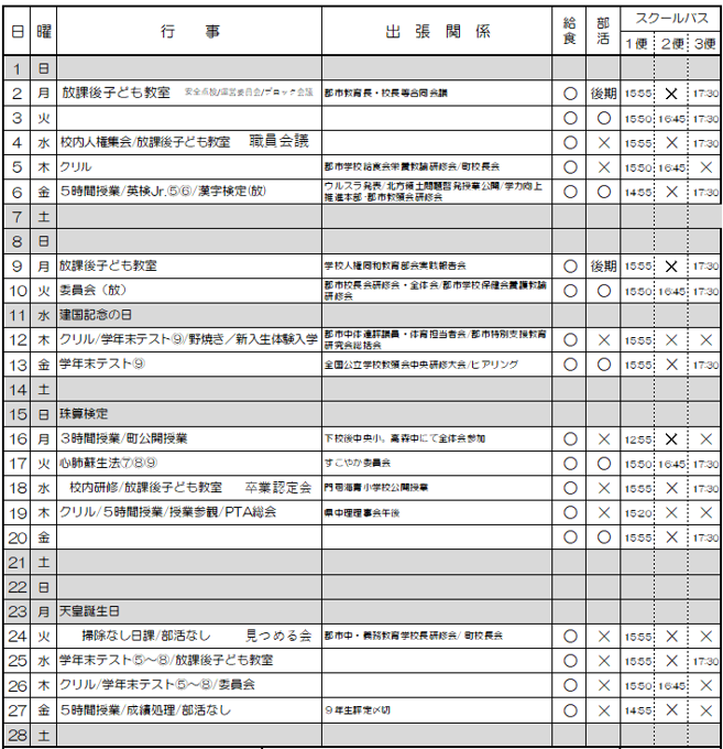 19日(木)5時間授業/授業参観/PTA総会/ブロック懇談会