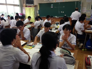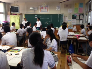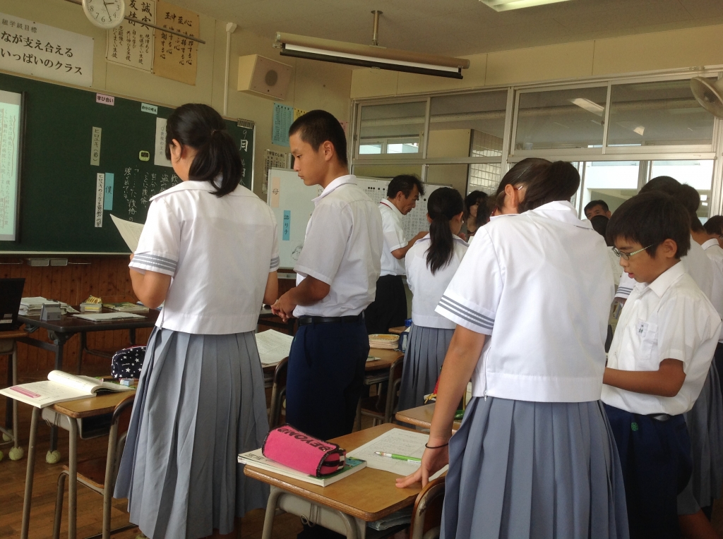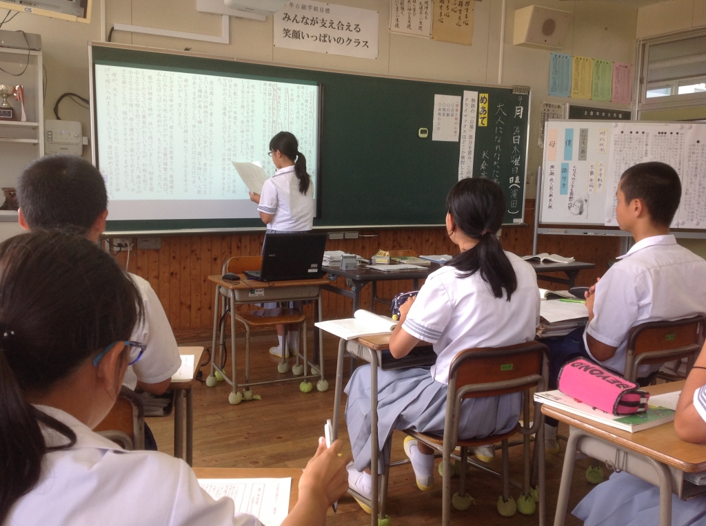 玉名管内から国語の先生たちが、玉中に集まりました。玉名教育事務所主催の中学校学力向上対策研修会です。公開されたのは、1年6組です。2年学年主任の松本教諭による少人数学級での授業です。教材名は、「大人になれなかった弟たちに・・・・・・」です。綿密な授業計画のもとに、すばらしい学びの姿が展開されました。自分の考えを持ち、他者と学び合うことで、更に、自分の考えを高めていくような授業が求められています。全員が授業に参加できるユニバーサルデザインの授業づくりを進めることで、21世紀に求められる資質・能力を身につけさせていきたいと思います。研究は始まったばかりです。これから、全職員で質的向上を目指していきます。