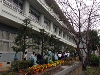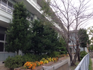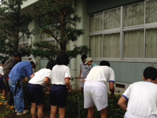 今日は、県立北稜高等学校の造園科10名と担当の先生方が来校されました。本校の卒業生も1人いました。目的は、玉中の園芸委員会との共同剪定です。といっても、準備から後始末まで、北稜高校の生徒さんにしていただいたのですが、剪定の仕方を学ぶことができました。玉中の生徒は園芸委員の3年生13名です。小雨の降る中での作業になりましたが、みんな一生懸命頑張ってくれました。特に、北稜高校の先生方には、午前中から作業車両で来ていただき、大がかりに剪定していただきました。おかげで見違えるように美しくなりました。本当にありがとうございました。すばらしい中高連携になりました。次回は、12月で門松づくりです。楽しみです。また、今回は、NHKの取材が入りました。放送日が分かったら、お知らせします。写真左がビフォー、右がアフターです。