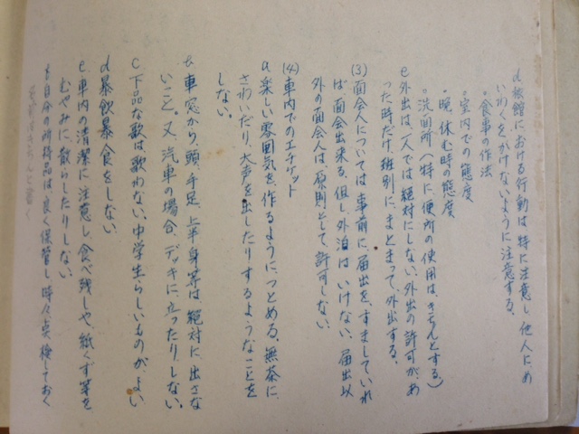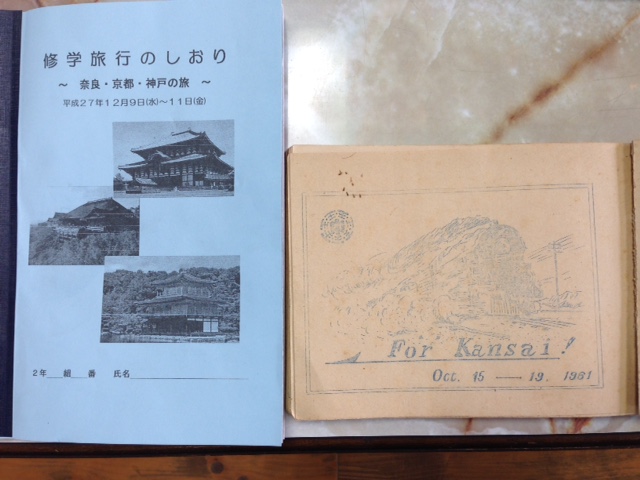 今日(12月2日)、54年前の玉名中での修学旅行のしおりが見つかったといって、地域の方が校長室にいらっしゃいました。そのことも驚きですが、来年度の55周年記念に、当時と同じ日程、コースで修学旅行を計画するということでした。しおりを見せていただきました。写真左は、今年のしおりと54年前のしおりです。写真右は、54年前のしおりの中にある、旅行の心得です。当時らしい表現がいくつもあってとてもなつかしく思いました。例えば、「車窓から頭、手足、上半身等は絶対に出さない」とか「汽車」という言葉です。当時は、蒸気機関車だったのです。他にも、「下品な歌は歌わない」等です。どんな歌を指しているのでしょうか、想像すると楽しくなりました。それに、、お小遣いは1200円でした。また、今年のしおりを見られて、同じルートがあったことにも驚いておられました。