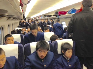 今日の出発式の様子です。実行委員長の西山君の挨拶で始まりました。とても寒い朝になりましたが、思いは熱いものを感じました。一回り成長して帰ってきます。お見送りの保護者の皆様ありがとうございました。行ってきます。写真は出発式と新幹線の中の様子です。