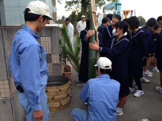 北稜高校造園科との第3弾です。門松づくりです。といっても、パーツはすべて北稜高校で作成済みで、後は、組み立てるだけです。造園科の生徒さんと先生方の手際のよさで、みるみるでき上がっていきました。もちろん、園芸委員のメンバーも手伝いました。さあ、これで、玉名中にいつ正月が来てもいい状態になりました。