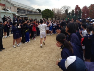 タスキにこんな願いがあったんですね。各クラスの思いや願いが1時間以上かけて学校の周囲を駆け巡りました。さて、「自学免除」は叶うのでしょうか。最後は、3年7組が全ての感動を持って行きました。この盛り上がりは周囲を温かい雰囲気で包み込みました。今日の結果は、金曜日に発表されます。お楽しみに。