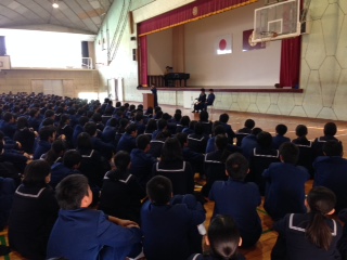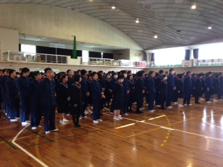 早いもので、今年最後の登校日、そして、全校集会になりました。整然と並ぶ生徒たち。体育関係、文化関係で多くの生徒が表彰されました。玉中の底力を感じました。学年代表発表も、振り返りと希望に満ちたものでした。頼もしさとたくましさを感じました。私は、「ウサギとカメ」の話をしました。生徒にも、話のあらすじと教訓を発表してもらいました。教訓としては、「どんな相手でも全力を尽くさねばならない。地道に努力し続ければ報われる」というのが一般的ですが、今回、伝えたかったのは、「ウサギはカメを見て競争していたが、カメは、目標を見て競争していた」ということです。競争するのは相手ではなく、自分自身の目標であり、自分自身であるということです。新しい年を迎えるに当たって、自分自身の目標に立ち返ってほしいと思いました。3年生は、夢膨らませ、自分の進路に向かって前進します。頑張れ!玉中生。