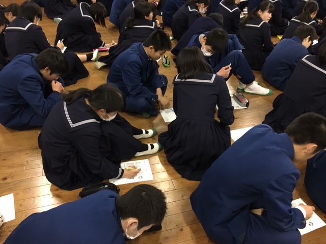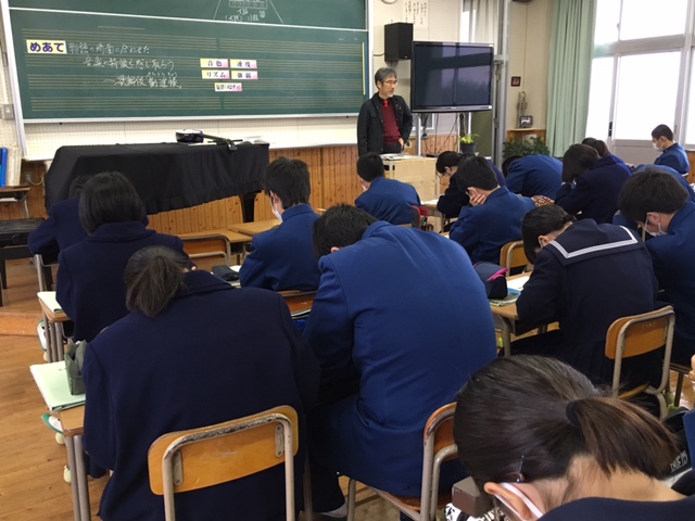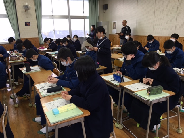 2月1日、音楽の研究授業です。歌舞伎の鑑賞の授業でした。「歌舞伎に親しもう」という題材です。大人でもなかなか歌舞伎を鑑賞するという機会は少ないと思います。金島先生が、映像を編集され、ダイジェスト版として解説を入れながら紹介してくださいました。生徒たちは、音楽の「速さ」「音色」「音の混じり合い」などに着目して鑑賞していきました。歌舞伎に対するイメージが変わったのではないでしょうか。