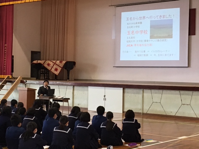 27日は土曜授業とともに、玉名市教育委員会生涯学習課の協力を得て、親の学び講座を行いました。生涯学習課の動画によるコミュニケーションスキルの学びに続いて、本校出身で福岡市で小学校の 先生をしておられる西畠知洋先生による講演がありました。先生は、青年海外協力隊としてコスタリカで環境教育のために活動した様子を、クイズ形式で大変楽しく伝えてくださいました。学級での助け合いは世界の国々との助け合いにつながるものであるというメッセージも伝えていただきました。親子、教師で考える学びの機会になりました。ご参加いただいた保護者の皆様、大変ありがとうございました。