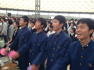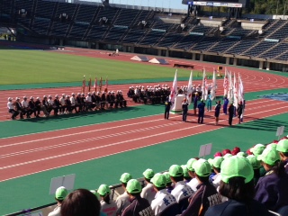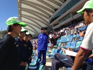 今日は朝の涼しさ(寒さ?)とうって変わって、日中は真夏の暑さになりました。本当に暑かったですね。応援の保護者の皆様、大変ありがとうございました。玉名中学校からは、18人の生徒が出場しました。先月行われた玉名荒尾の大会で上位入賞した生徒たちです。「うまかなよかなスタジアム」という大変立派な会場で競技できる喜びを味わえたことと思います。最終的な結果はまだ伝わってきませんが、十分にやりきったと思います。選手の皆さんは、出場したことに自信と誇りを持ってください。引率の先生方を含め、関係された先生方も大変ご苦労様でした。写真は、開会式、担当の先生方と振り返りをしている生徒たちの様子です。