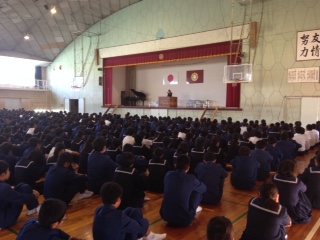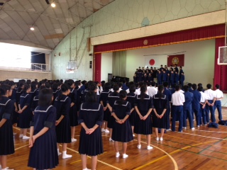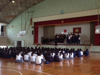 今日、10月9日(金)に前期終了式を行いました。早いものです。今年度になって、半年が過ぎました。式の前段で、表彰を行いました。地区大会、県大会、九州大会、全国大会と多くの生徒が玉名中学校の代表として活躍してくれました。とても大きな功績を残してくれました。式では、各学年の代表が、前期の振り返りと後期に向けての決意を、堂々と発表してくれました。とても、たのもしく思いました。ただ、前期終了といっても、連休明けが後期です。合唱コンクールに向けての練習も熱がこもってきました。スポーツに続いて、文化の秋で盛り上げていきましょう。写真左は、2年生の練習を3年生が聞いている様子、写真右は、3年生のプレ合唱コンクールの様子です。