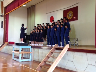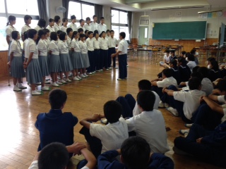結果は、最優秀賞7組、優秀賞5組、最優秀指揮者賞 小山 亜美さんでした。おめでとうございます。次は、文化発表会の日に1,2年生の上位各2チームと競うことになります。写真は、エントリーナンバー1番の1組が、全員合唱をリードしている様子です。保護者の皆様、たくさんの応援、ありがとうございました。