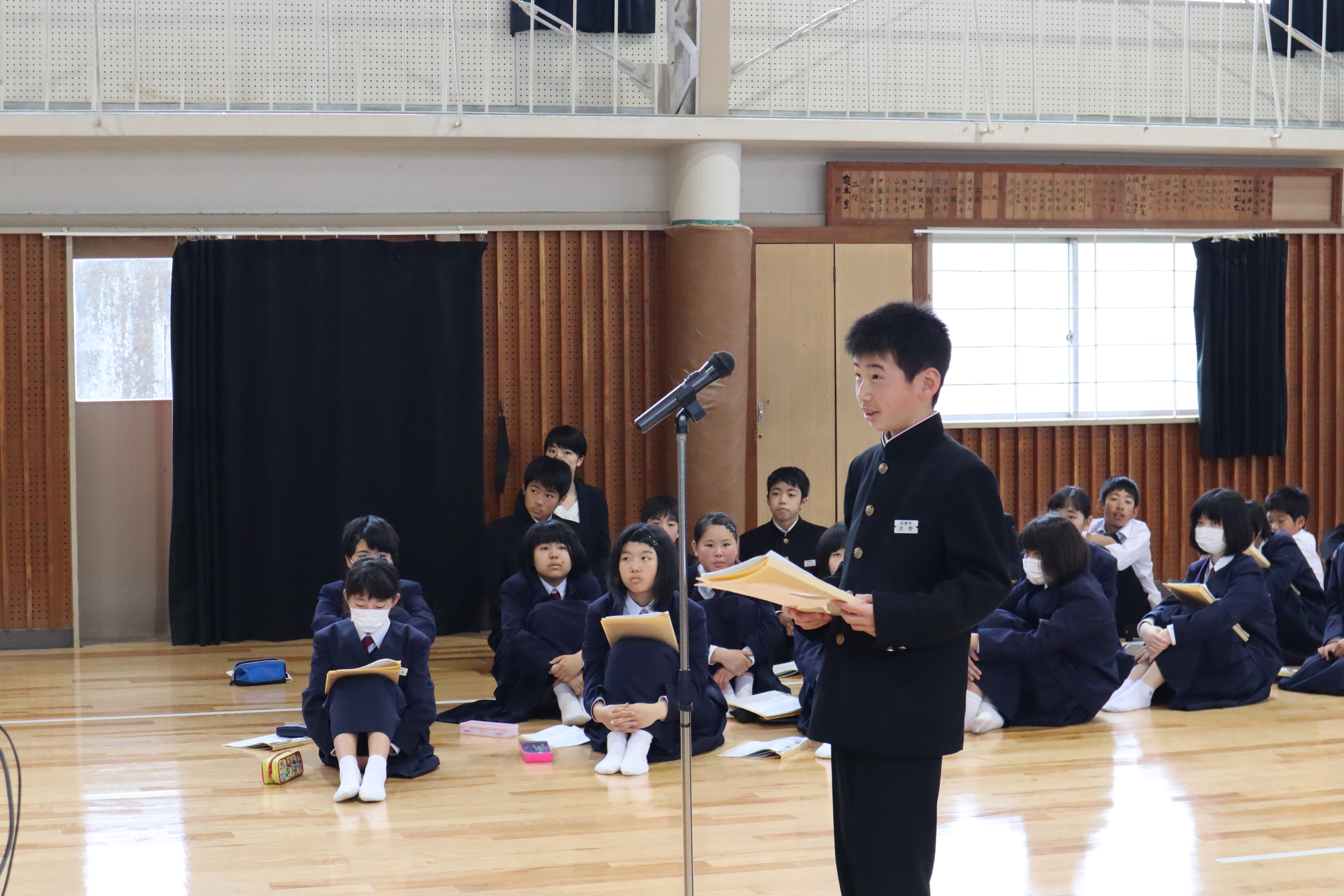 生徒総会が開かれ、今年度の生徒会スローガン「田浦中PRIDE」のもと、各委員会がどのような活動をおこなうかについて質疑応答、採決がされました。