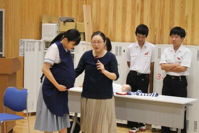 講師として、八代市の病院で助産師をされている嶽本様をお招きしました。講演では、助産師の仕事や命が宿る過程(赤ちゃんの成長)、思春期の特徴、性感染症についてなど、多岐にわたる内容についてお話をいただきました。また、妊婦体験では4名の生徒が妊婦エプロンを装着し、ハンカチを拾う、靴下を履くといった日常の動作を体験しました。