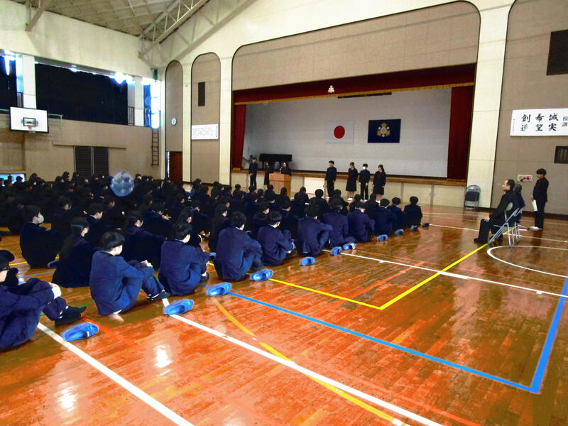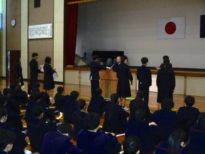 後期後半が8日(木)から始まっています。 保護者・校区のみなさま、 今年もよろしくお願いします。 ◎12月24日(水)は後期前半終了日。休み前集会で多くの表彰を行ったあと、 新生徒会役員の認証式を実施しました。 ◎8日(木)に旧生徒会役員へ感謝状を渡す会を行いました。 新委員長の認証式は、15日(木)の予定です。