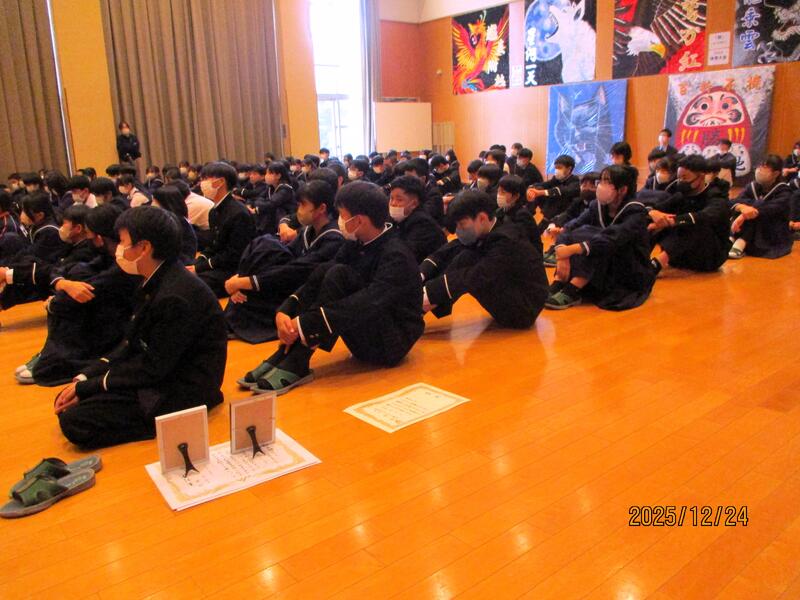 12月12日(金)午後、体育館にて全校生徒参加の「令和7年度 生徒・職員合同会議」を行いました。