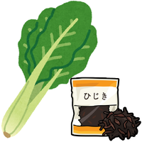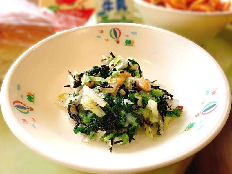 「こつこつサラダ」には、カルシウムを とれる食材(しょくざい)[ひじき・小松菜(こまつな)]が使(つか)ってあります。