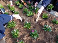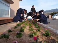 2月19日(木)放課後、事務職員の○○先生、教員業務支援員の○○先生の事前準備により、環境委員の子どもたちが花苗を植えて、図書室前に新しい花壇が完成しました!