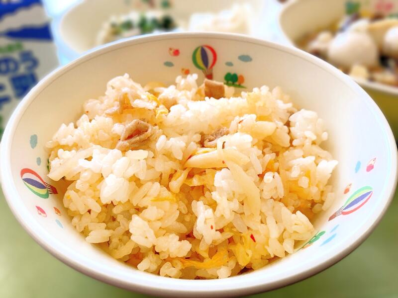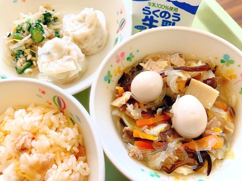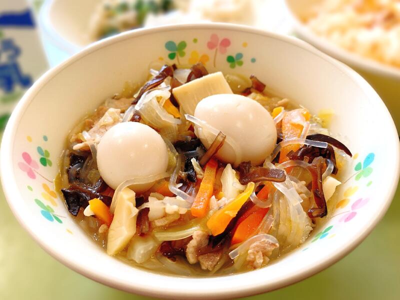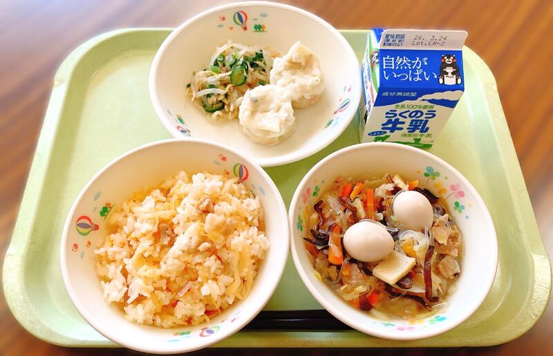 今日(きょう)のメニューは、児童・生徒(じどう・せいと)の みなさんからリクエストが多(おお)かった「キムたく ごはん」と「タイピーエン」です