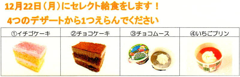 選べるデザートは「イチゴ ケーキ」「チョコ ケーキ」「チョコ ムース」「いちごプリン」の中から1つです!!!
