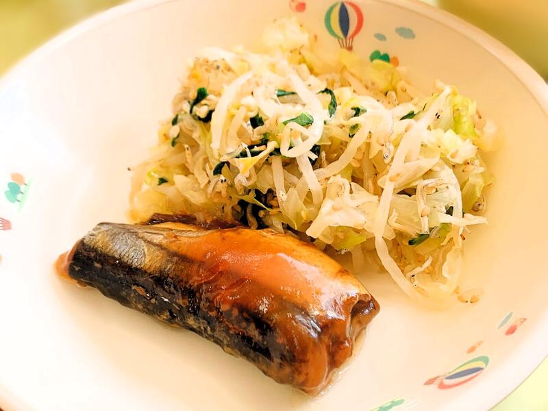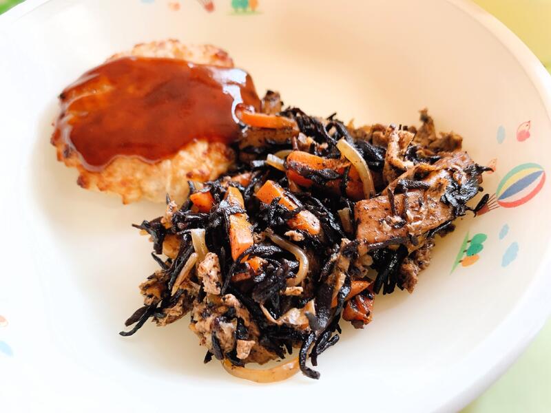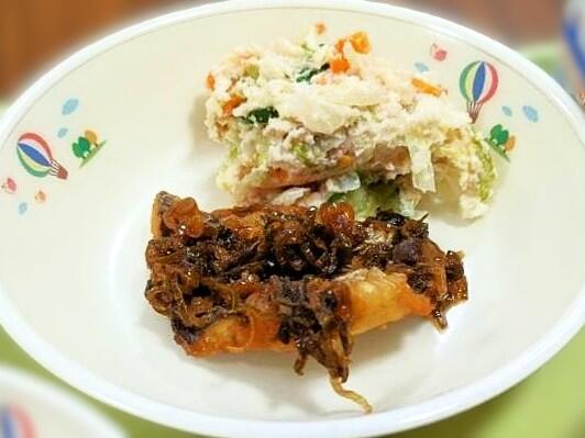 今日のサラダの「こんにゃく」は、砂糖(さとう)、醤油(しょうゆ)と一緒いっしょに炒めて下味(したあじ)をつけてありますよ!