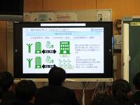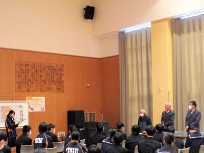 説明会では、新生徒会の2年生三役(会長・副会長・書記)の3名が、新入生となる6年生児童とその保護者のみなさんに向けて、天水中での学校生活についてプレゼンテーションを行いました。