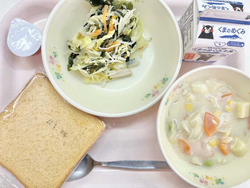 トマトパン、クリームシチュー、海藻サラダ、トマトゼリー
