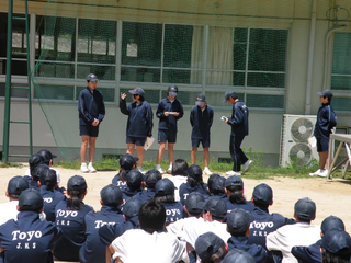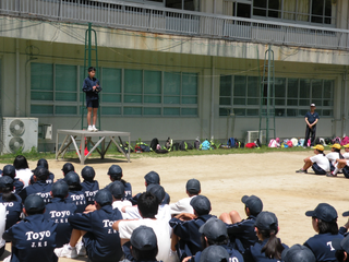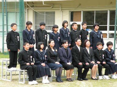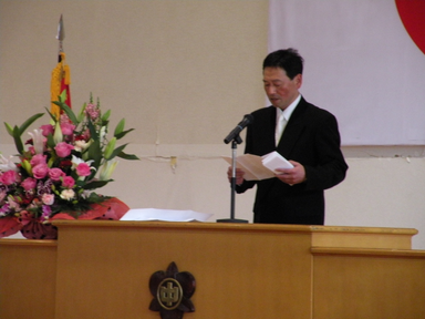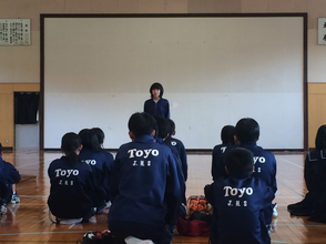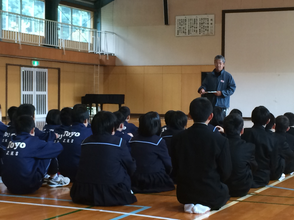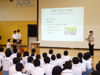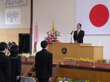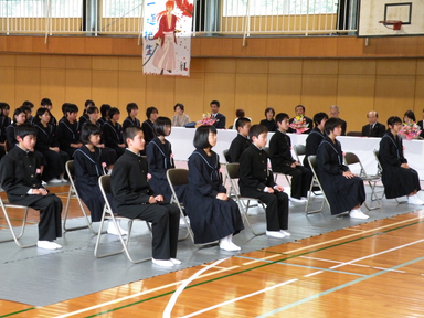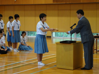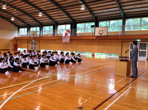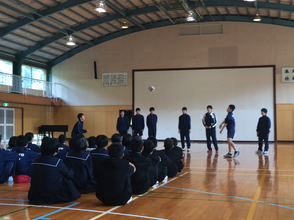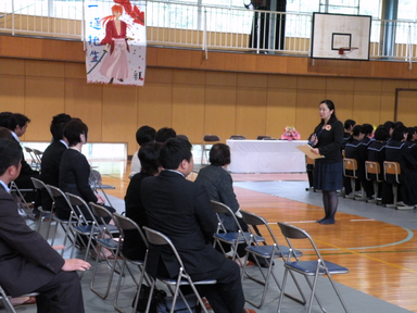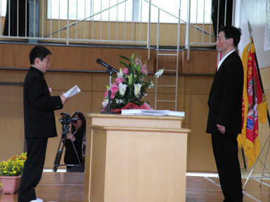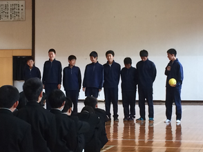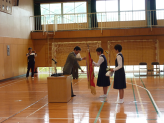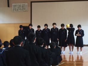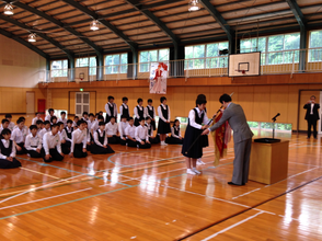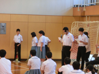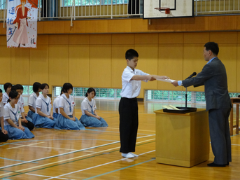 まず表彰が行われ、第1回中学生創作料理コンテスト優秀賞受賞者、第11回八代地区科学発明展の特選ならびに入選受賞者、第13回八代地区ハンドボール新人戦大会優勝の男子ハンドボール部、八代地区新人スポーツ大会バレーボール競技で、1年生の部準優勝の男子バレーボール部(第七中学校との合同)に賞状が渡されました。