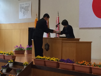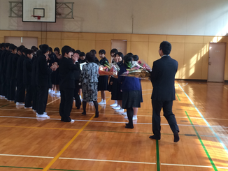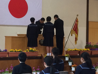 生徒会執行部と各専門委員会から今月の活動目標が発表された後、先日行った生活委員会主催の無言清掃クラスマッチの表彰が行われました。