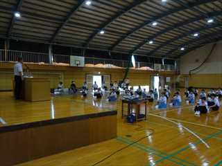 出発式:雨天のため武道場で行いました。