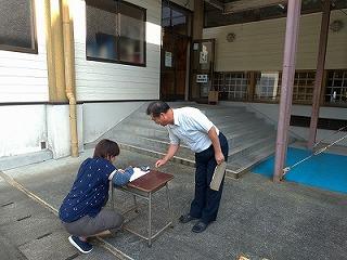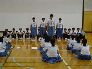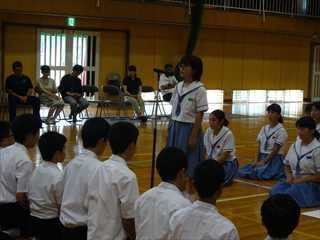 本日(6月18日)、避難訓練を行いました。今回は、集中豪雨による川の増水や崖崩れなどを想定しての避難訓練でした。生徒たちは、避難の放送後に帰り支度をして体育館に集合しました。そして、東陽支所から来られたお二人の方から「私たちにできること~風水害に備えて~」の講話を真剣に聞いていました。