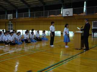 英語暗唱大会2位、チャレンジタイム満点賞(数学・英語)、バレー部の大会での入賞、八代人権擁護委員協議会長賞、八代子どもの美術展入選、中学生税の作文、校内駅伝持久走大会の表彰がありました。