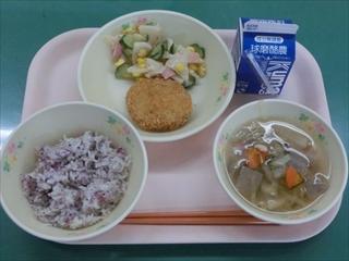 さつまいもごはん、カシュナッツサラダ、メンチカツ、かきたま汁、牛乳