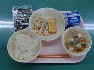 こぎつねご飯、春雨の酢の物、いわしの梅煮、すまし汁、牛乳