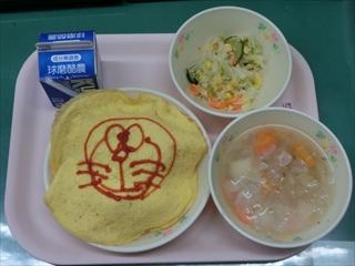 オムライス、マカロニスープ、ナタデココのヨーグルトあえ、牛乳