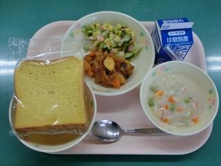 ミルクパン、ビーフシチュー、コールスローサラダ、こんさいチップス、牛乳
