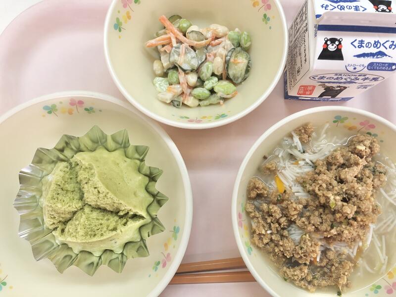 お茶蒸しパン、肉みそビーフン、ビーンズサラダ