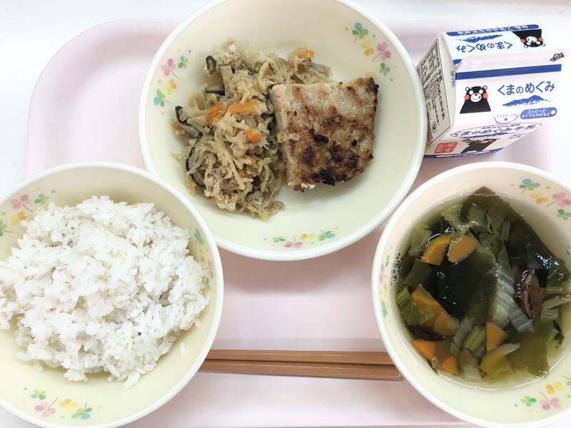 麦ごはん、大根のみそ汁、魚の揚げ煮、金平ごぼう