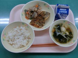 麦ごはん、れんこんの金平、魚のピリ辛揚げ、すまし汁、牛乳