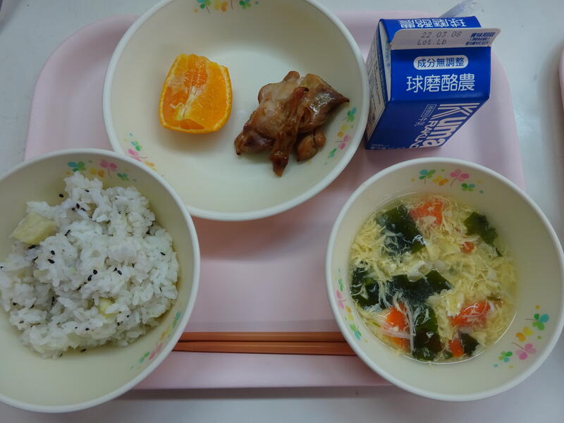 さつまいもご飯、かきたま汁、鶏の照り焼き、不知火、牛乳