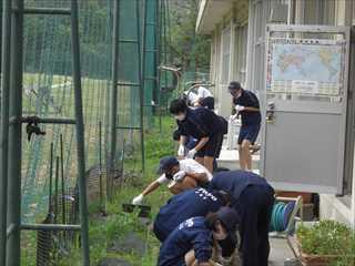 本日(6月8日)、月1回の外庭掃除の日が始まりました。東陽中は全校生徒42名で、日頃はなかなか外の掃除ができませんので、今年度は月1回、全校生徒で外の掃除をすることになりました。今回は校舎周辺の除草作業をしましたが、蒸し暑さにも負けず、全員一生懸命に頑張りました。