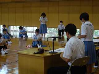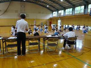 本日(6月18日)、避難訓練を行いました。今回は、集中豪雨による川の増水や崖崩れなどを想定しての避難訓練でした。生徒たちは、避難の放送後に帰り支度をして体育館に集合しました。そして、東陽支所から来られたお二人の方から「私たちにできること~風水害に備えて~」の講話を真剣に聞いていました。