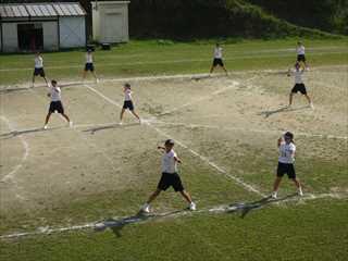 今日(8月26日)の全体練習は、昨日の集団行動の続きでした。行進しながら列の数を増やしたり減らしたりしていきました。最後は記念撮影の隊形までつくりました。生徒たちは、一所懸命取り組みながらも和やかな雰囲気で頑張りました。