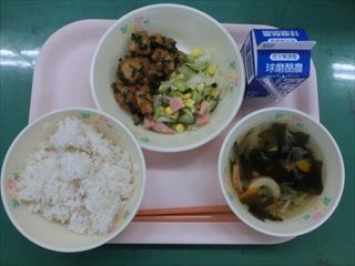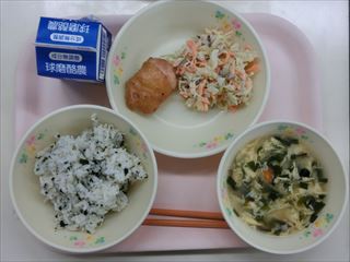 わかめごはん、かみかみサラダ、鶏の照り焼き、